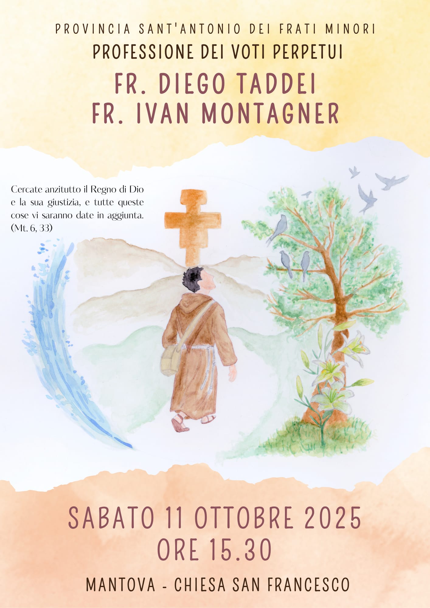 La Provincia Sant’Antonio dei Frati Minori annuncia con gioia la Professione dei voti perpetui di Fr. Diego Taddei e Fr. Ivan Montagner, un passo decisivo nel loro cammino di consacrazione al Signore secondo lo spirito di San Francesco.